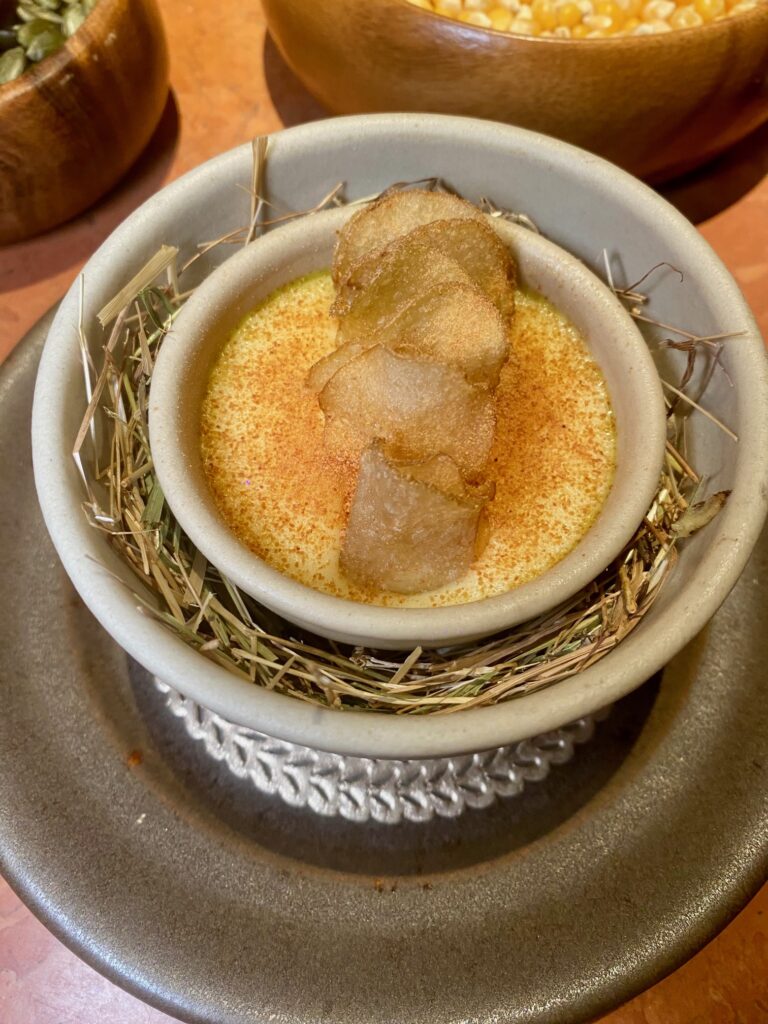 Las papas de Trás-os-Montes, famosas por su excelencia, se transforman en un puré sedoso, enriquecido con hierbas y leche dorada de vaca Jersey. Chips fermentadas del mismo tubérculo y un miso de chantarelas cierran el círculo con profundidad umami.