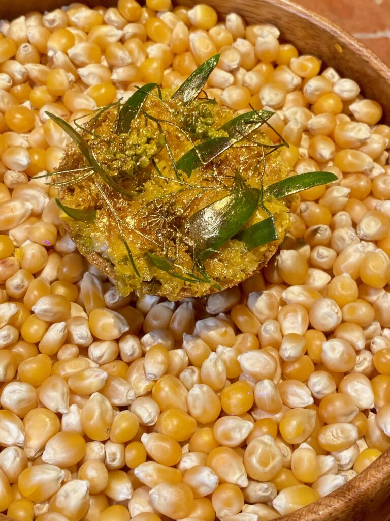 La calabaza Hokkaido, pequeña joya estacional, dialoga con kéfir de cabra, vinagre Messianico extra añejo, calamansi y aceitunas Galega. Dulzor, acidez y perfume en equilibrio.