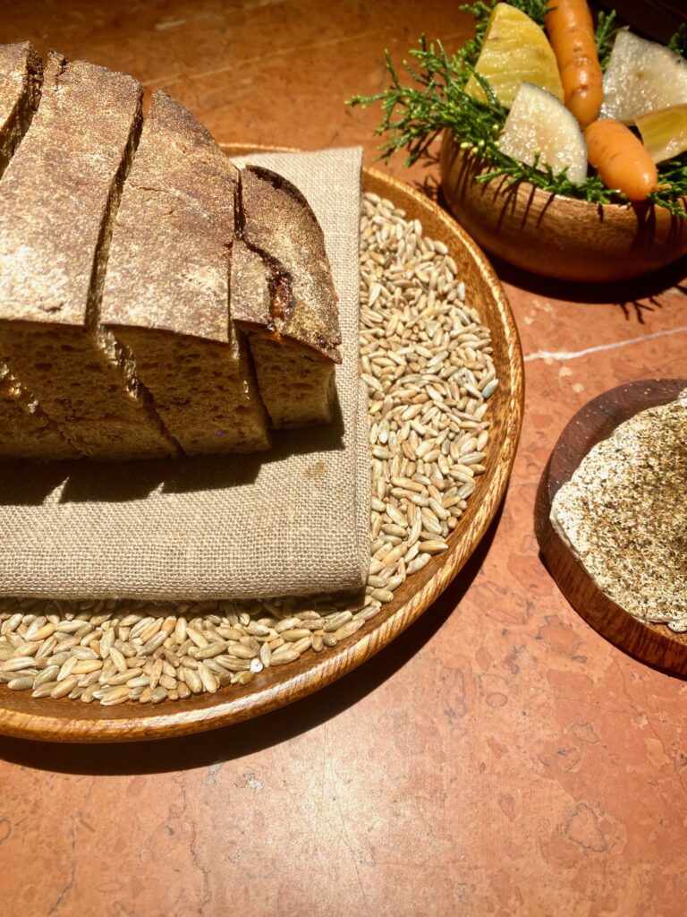 El pan de centeno, imprescindible en la narrativa nórdica, merece una pausa: elaborado con harinas portuguesas y amazake de koji casero, acompañado de una whipped butter memorable, encurtidos crujientes y notas ahumadas. Un momento que se queda en la memoria.