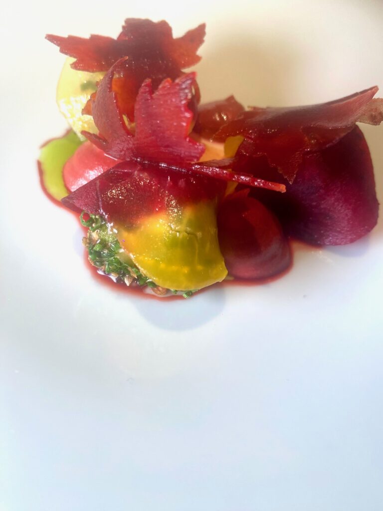La remolacha y cabra, claramente influenciada por la expresión artística de Geranium, juega con texturas y temperaturas: cruda y horneada en costra de centeno y sal, queso de cabra joven, reducción de oporto y ginja, emulsión de enebro y piñones. Se acompaña de un donut fermentado de remolacha con queso curado. Arte comestible.