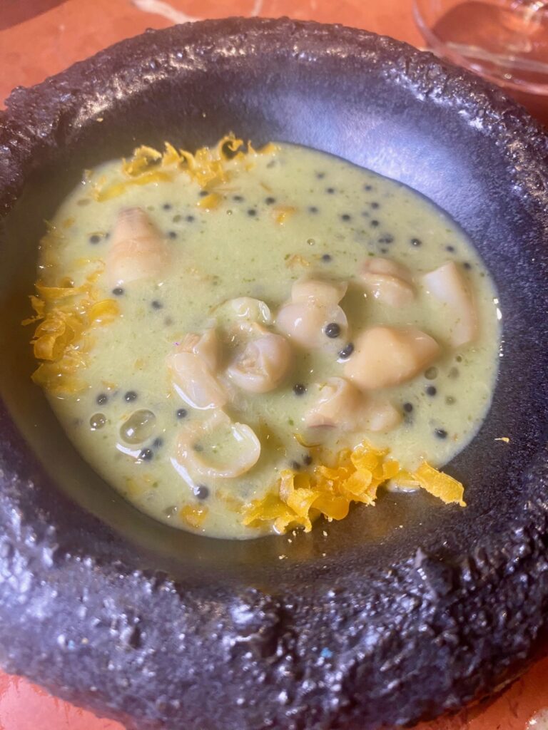 El plato de huevo, firma de Vibe, se reinterpreta con navajas: flan ligero de caldo marino, yema curada y beurre blanc servido en mesa, enriquecido con caviar, cítricos y profundidad atlántica.