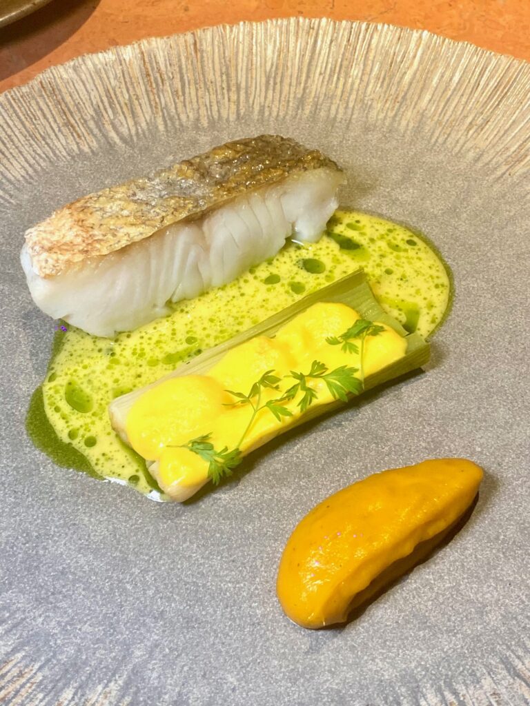 La merluza dry-aged, marcada al carbón, llega con zanahorias glaseadas, beurre blanc de mejillón, jugo de zanahoria y un delicado zabaione de azafrán.